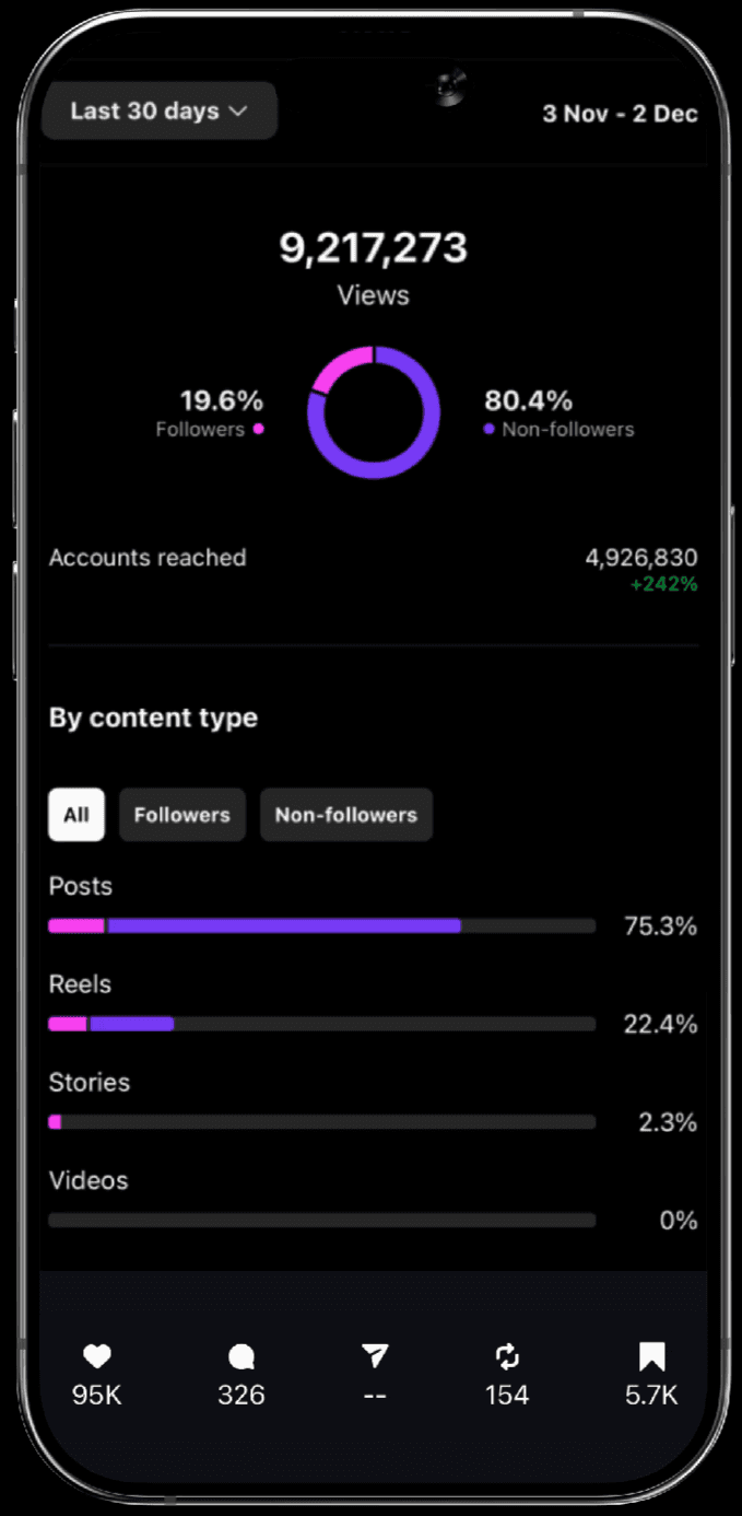 We run a major Instagram network of more than 3 million followers, that live and breathe for techno. Every theme page and influencer in our network is packed with real engagement, ensuring our campaigns are aimed at precisely the right audience.